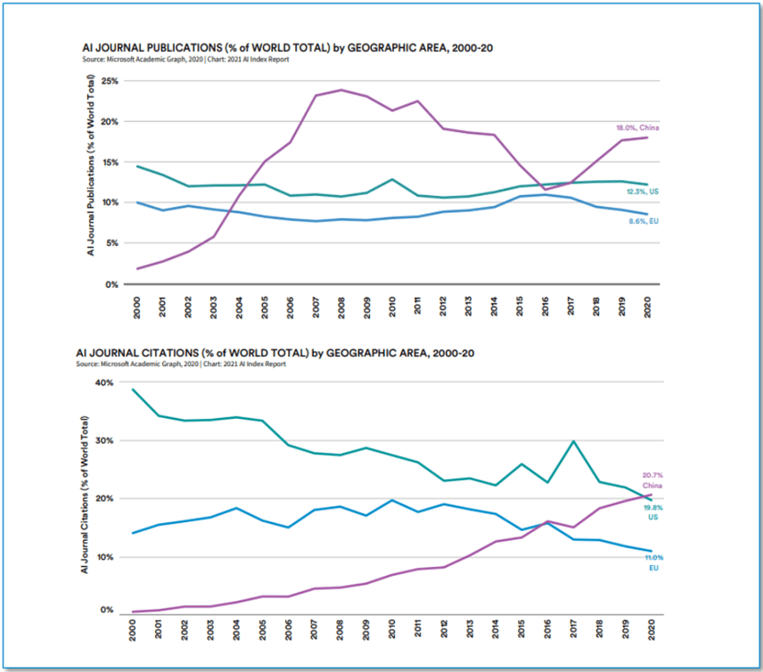 人工智能具有顺应特征,2020年中国期刊颁发数量以18.0%的比例跨越美国(12.3%)和欧盟(8.6%)。政策带动相关行业成长,并强调了人工智能等新兴数字财产正在提高国度合作力上的主要价值。